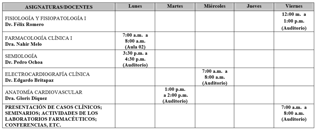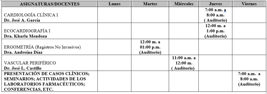 HORARIO DE LAS ASIGNATURAS DEL I SEMESTRE 2026 DEL POSTGRADO EN CARDIOLOGÍA CLÍNICA (1ER AÑO)